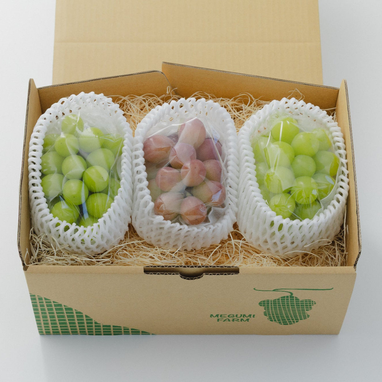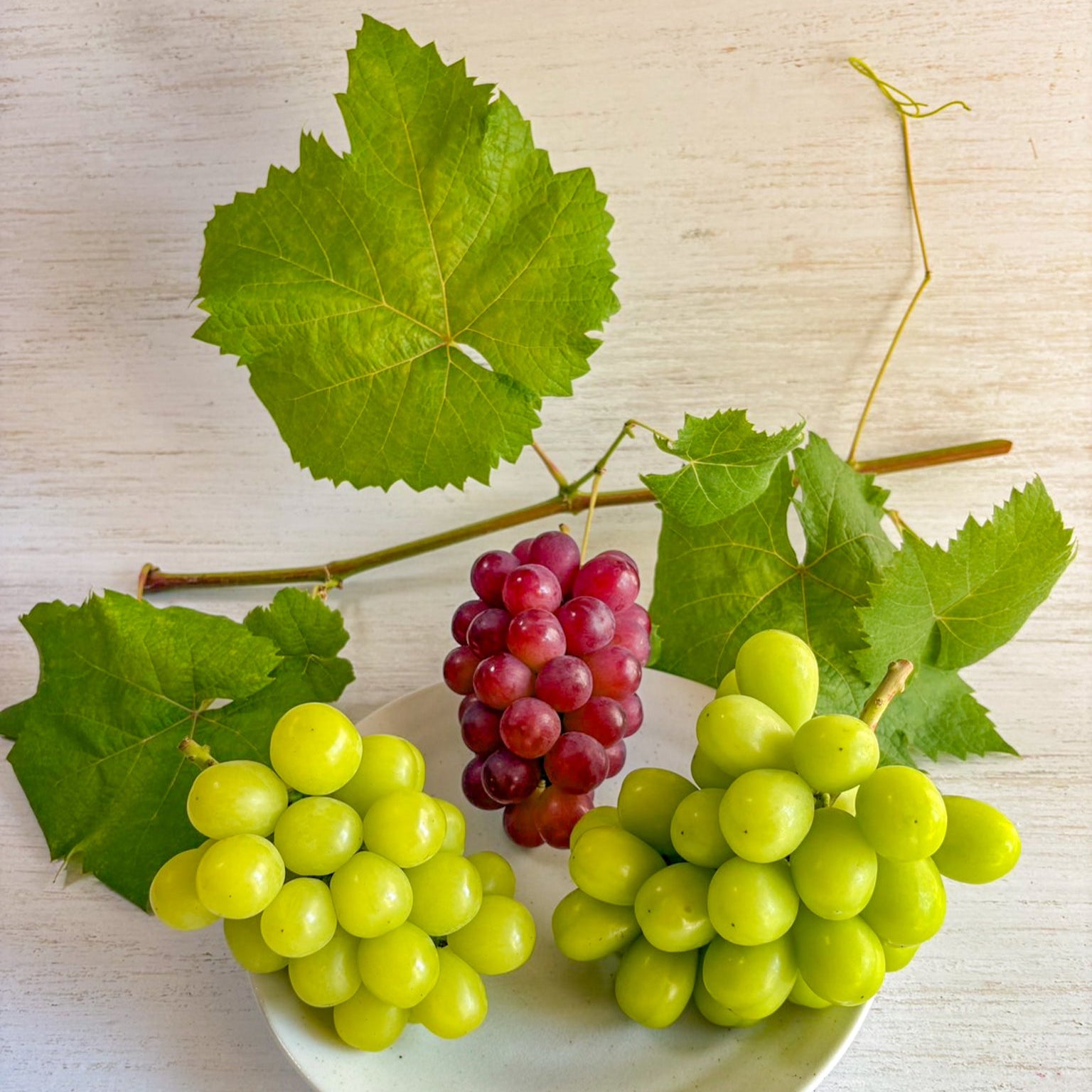 シャインマスカット(400g×1房)、スカーレット(400g×1房)、マスカサーティーン(400g×1房)の3種盛り合わせです。